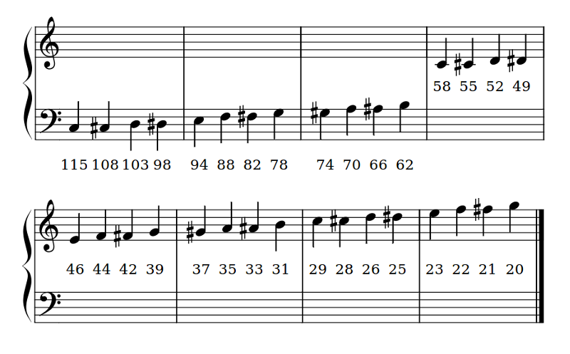 这是通过在音素上注释音高相关号来完成的。数字越小,音高越高。数字大致翻译成音符,如下图所示:
